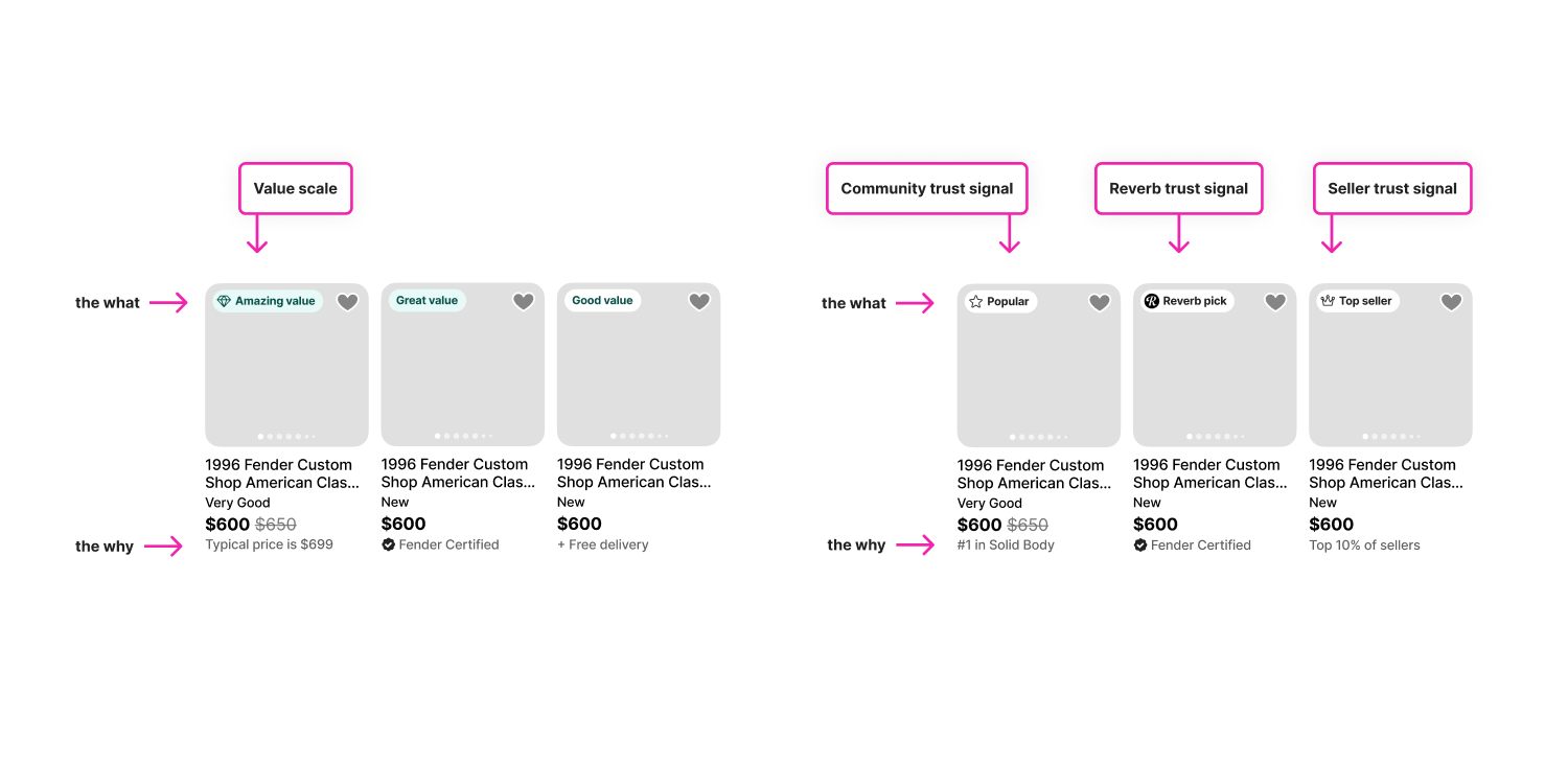 Simply placing value badges on item cards is not enough. To inspire trust, it’s necessary to show why the badges are present.